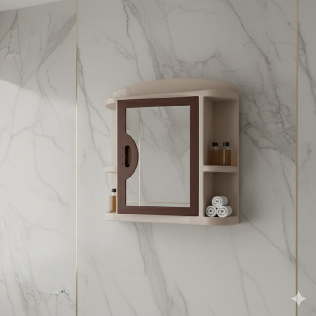 This is a modern, compact Cabinet with Mirror designed specifically for organized bathroom storage. The cabinet features a sleek white frame and a combination of open shelving and a concealed cabinet with a door. The internal structure includes multiple fixed compartments of different sizes, allowing you to neatly store various toiletries, from tall bottles to small jars. Its durable plastic construction makes it ideal for humid bathroom environments, offering an easy-to-clean and rust-free storage solution. The design is intended to be mounted directly above a sink or vanity.