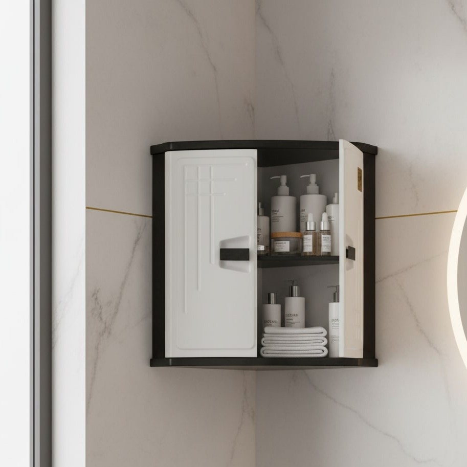 This Corner Storage Cabinet features a space-saving design with a white body, contrasting black trim, and double doors. It effectively uses unused corners to provide concealed, dust-free storage for toiletries and small items in your bathroom.