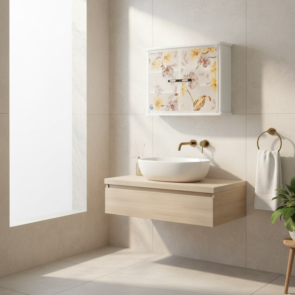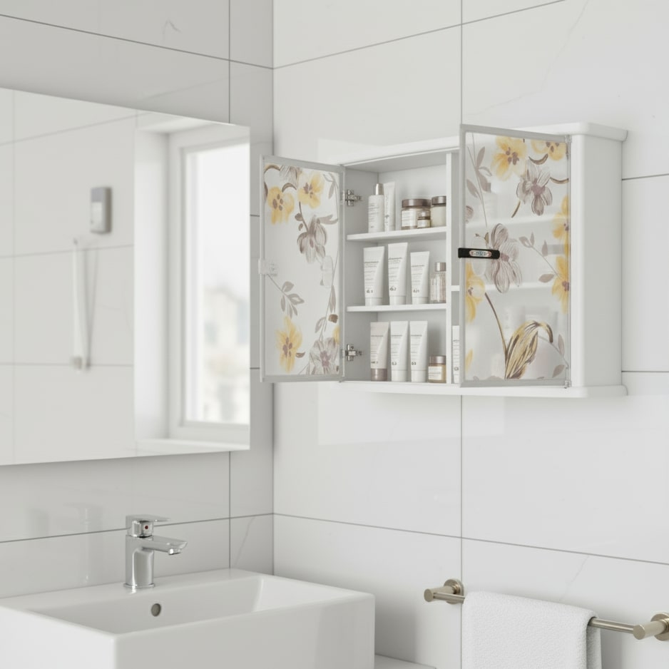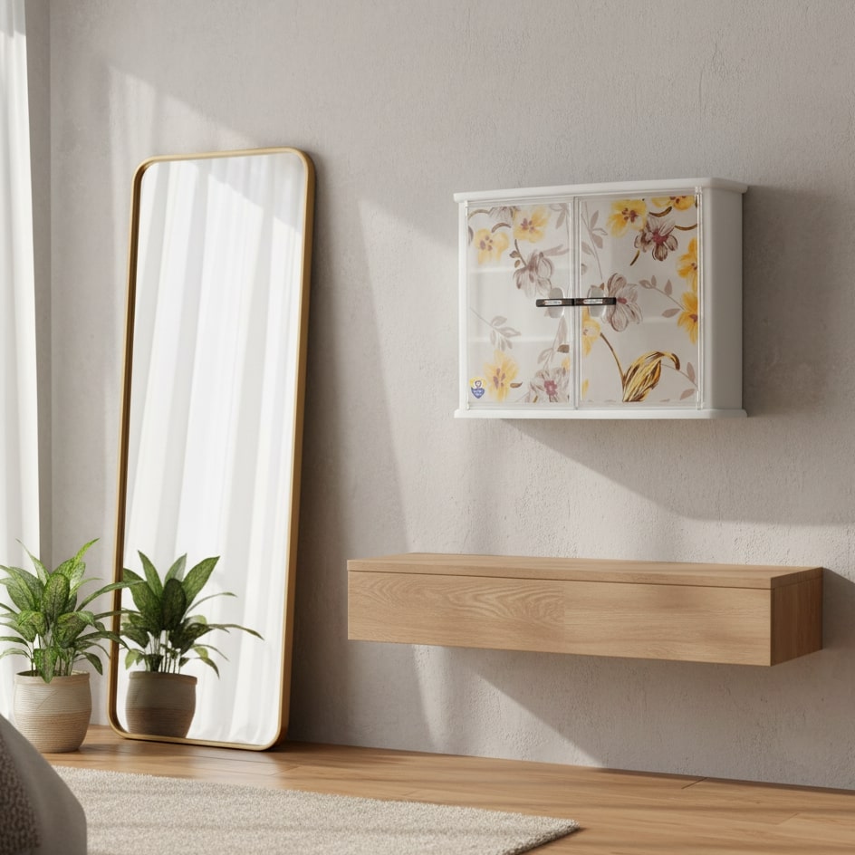This decorative Wall Mounted Cabinet features a stylish yellow and brown floral print on the doors and a durable white plastic frame. It offers easy-to-clean, dust-free storage for toiletries, spices, or small household items, blending practicality with elegant home decor.