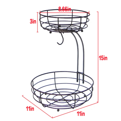 Perfect fruit storage and display solution! This 2-tier fruit basket bowl keeps your favorite fruits and veggies fresh and organized. Features a sturdy design, smooth surface, and raised feet for easy cleaning. Ideal for kitchen countertops, parties, and family gatherings. Dimensions: 11″ x 15″ (bottom basket: 8.8″ x 2.7″, top basket: 11″ x 2.7″). Easy installation, no tools required material Solid Iron Wire.